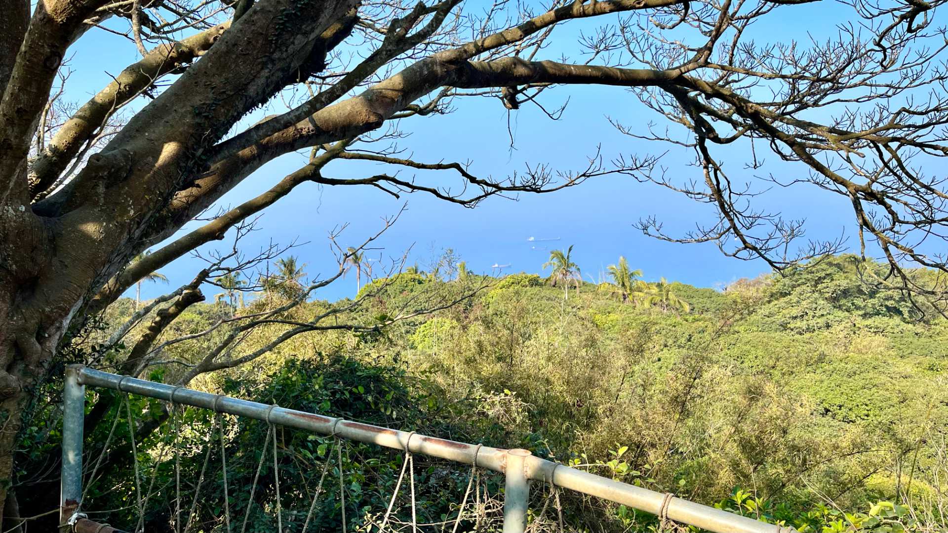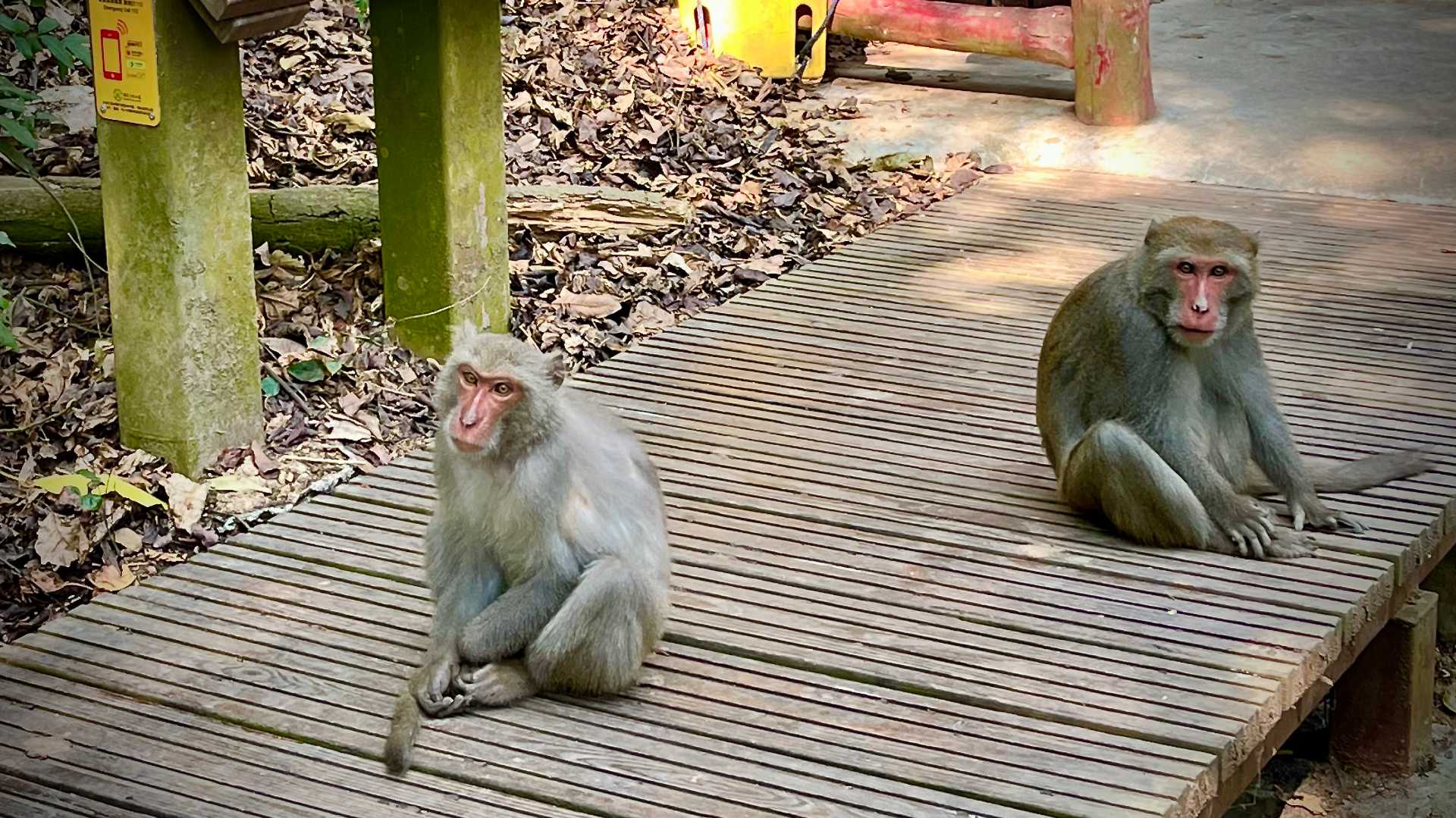 The walk started next to Longquan Temple (萬壽山龍泉禪寺).The start of the track involved climbing these steps between shops that sell drinks, food, and hiking supplies.As we entered the forest, a series of signs warned “Why feeding and touching monkeys is a bad idea”, and explained what to do if a monkey jumps on you: Slowly walk back, and wait for the monkey to jump off when it gets bored.The entire walkway to the top comprised wooden stairs……And boardwalks.The only time we touched the ground was when squeezing through these rocks. Otherwise, the whole multi-kilometer-long track was elevated. (There were more challenging dirt tracks, but I’m scared of snakes…)We could see the city a couple of times on the walk. As you can see, air pollution was bad on Sunday morning—but the mountain air was fresh.We passed a couple of bamboo groves. The bamboo was thick and perhaps 20 or 30 meters tall.I saw volunteers carrying 20L water containers to the top of the mountain. I’ll explain this later……But first, monkeys! I lost count of how many I saw. Perhaps 50 or 100.Some were really young, like this tiny monkey at the start of the track.Many were in the trees.Most of them ignored people passing by. I only encountered one that was aggressive, lunging as I passed. But it had done the same thing to someone ahead of me, so I didn’t take it as a personal affront.There were small pavilions along the track. At one, a man was practising tai chi. At another, an adult monkey was holding a younger monkey’s hand.Remember those volunteers carrying water up the mountain? Here, at the mountaintop pavilion, they make tea for the hikers. It’s completely free; they don’t accept donations. Taiwanese people are amazing.On the mountaintop we sat amongst the monkeys, having a drink……And enjoying the view over Taiwan Strait. Recommended.